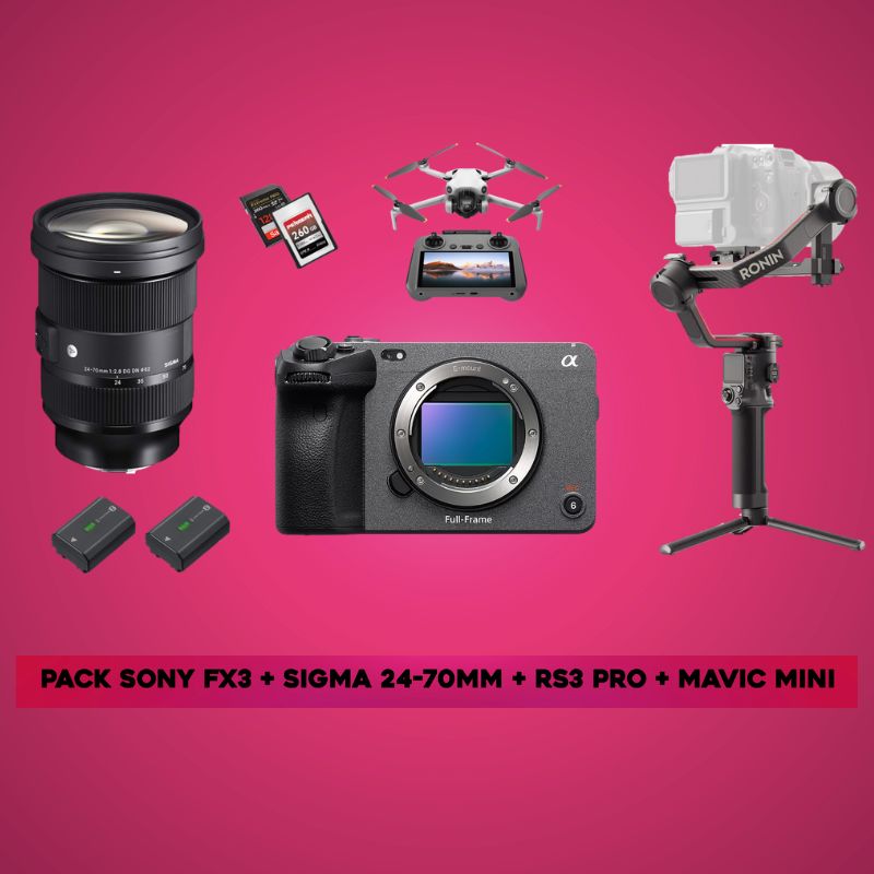 FX3, SD 256g Type A + Lecteur, Objectif 24-70mm 2.8, 2 batteries, RS3 Pro, DJI Mavic 4 mini, Sac de transport